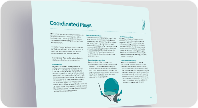 e tion dina oor art 10 c f Coordinated Plays P The importanco Plays can go way beyond basic prospecting into Deal acceleration Plays Upsell/cross-sell Plays target accounts to include every step of the Sales development and marketing doesn’t stop Upsell Plays orchestrate interactions with buying journey – including Customer Success when the account moves into the deal stages. customers you already know, helping them – as well as customer-facing interactions from Instead, they should support the AE to increase to get value from their solution so they buy any department. win rates, justify a higher selling price, and more. Cross-Sell Plays are about introducing increase deal velocity. A Play that surrounds the additional solutions, often to new users and If it matters to your business, there’s a Play that account with broader awareness and touches buyers at the same company – ideally using can help you achieve it. After all, these critical influencers that the AE isn’t talking to works your prior success as a starting point. Again, goals and processes demand and deserve wonders for this. Targeted Account Based marketing has a role to play here, keeping the careful attention and pinpoint execution. advertising and retargeting programs are a new solutions top-of-mind during your upsell/ great tactic here. cross-sell campaigns. Your extended Plays might include strategic initiatives and tactical programs such as: Executive alignment Plays Conference meeting Plays Design and run a Play to connect your Events cost a lot of money to create or Handoff Plays executives with executives at customers and participate in. You can’t just wait for the key Anytime a customer’s primary contact is prospects. This will be built around highly- people in target accounts to show up at your changing from one owner to another, the last relevant emails that come directly from your event or at your stand. Running a coordinated thing you want is to fumble the handoff. If a executives. But it can also include direct mail Play around an event is a great way to maximize prospect agrees to a meeting with an Account and targeted ads in places like LinkedIn to raise your return on investment by setting up meetings Executive, a best-practice handoff can include your brand’s profile just as the executive with the right people from the right accounts. an email introduction to the AE, followed a few approaches are being made. An email/voicemail/social media blitz can fill minutes later by an email from the AE directly, your time slots with high-value conversations. and a series of follow-ups if the customer And social media or banner advertising can doesn’t respond for any reason. Similar, when the reinforce the urgency and relevance. AE closes a deal, they can launch a best-practice Play to introduce the Customer Success Manager and start the onboarding process. 92