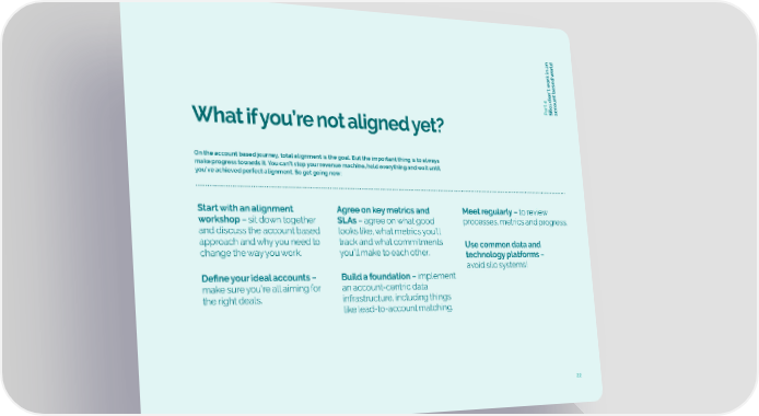 orld ork in an w ’t based w t oun art 4c P Silos donac What if you’re not aligned yet? On the account based journey, total alignment is the goal. But the important thing is to always make progress towards it. You can’t stop your revenue machine, hold everything and wait until you’ve achieved perfect alignment. So get going now: Start with an alignment Agree on key metrics and Meet regularly – to review workshop – sit down together SLAs – agree on what good processes, metrics and progress. and discuss the account based looks like, what metrics you’ll approach and why you need to track and what commitments Use common data and change the way you work. you’ll make to each other. technology platforms – avoid silo systems! Define your ideal accounts – Build a foundation – implement make sure you’re all aiming for an account-centric data the right deals. infrastructure, including things like lead-to-account matching. 22