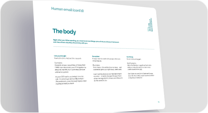 Human email (cont’d) t Based t elopmen v oun c c art 9 A f P The WHERE oSales De The body Right after your killer opening, you need to do two things: prove that you did your homework and show them why they should stay with you. Use your insight Be excited Don’t brag Now’s the time. Roll out the research. People want to work with people who love No one likes a braggart. what they do. Examples: Bad Examples: Congrats on your acquisition of Global Felt! Examples: We’re the Number 1 supplier of lard to the I think I can accelerate your IT integration by To be honest, the article blew me away – and defense industries and we’ve won every about six months, but I won’t know for sure I wanted to get to you right away. Here’s why: Lardie Award since 1983. until we’ve spoken. I can’t wait to show you our new benchmark Don’t take my word for it: CustomerCo says As your CEO said in yesterday’s investor research – it totally changed the way I think we’re the ‘best lobby carpet solution provider call, “It’s time to go all in on Blockchain.” about managed print services and I know it’ll in Southeast Nebraska’. The problem is, your Microsoft legacy stack do the same for you. is going to hold you back. 65