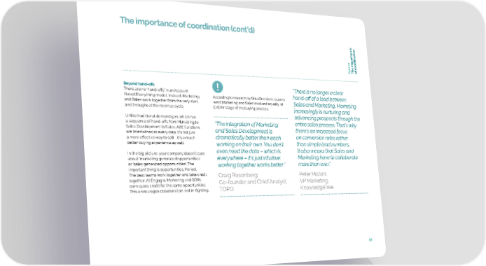 The importance of coordination (cont’d) e tion dina oor art 10 c f P The importanco Beyond hand-offs “There is no longer a clear There are no ‘hand-offs’ in an Account hand-off of a lead between Based Everything model. Instead, Marketing According to research by SiriusDecisions, buyers and Sales work together from the very start, want Marketing and Sales involved equally at Sales and Marketing. Marketing and throughout the revenue cycle. EVERY stage of the buying process. increasingly is nurturing and Unlike traditional demand gen, which has advancing prospects through the a sequence of hand-offs from Marketing to “The integration of Marketing entire sales process. That’s why Sales Development to Sales, ABE functions and Sales Development is there’s an increased focus are intertwined at every step. It’s not just on conversion rates rather a more effective way to sell – it’s a much dramatically better than each better buying experience as well. working on their own. You don’t than simple lead numbers. In the big picture, your company doesn’t care even need the data – which is It also means that Sales and about ‘marketing generated opportunities’ everywhere – it’s just intuitive: Marketing have to collaborate or ‘sales generated opportunities’. The working together works better.” more than ever.” important thing is opportunities. Period. The best teams work together and take credit Craig Rosenberg Peter Mollins together. At Engagio, Marketing and SDRs Co-founder and Chief Analyst, VP Marketing, earn quota credit for the same opportunities. KnowledgeTree This encourages collaboration, not in-fighting. TOPO 86