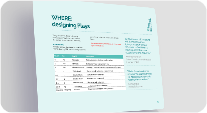 t Based t elopmen WHERE: v oun c c art 9 A f designing Plays P The WHERE oSales De The goal is a well-designed, neatly As we’ll see in the next section, coordination “Companies are still struggling orchestrated Play that proves itself in is key. with their touch patterns. the real world and improves over time. But remember: Plays are like diets – they work A few years ago, it was just A sample Play if you stick to them. ‘Do more touches!’ Now it’s Here’s a sample play based on one from more sophisticated: more TOPO, showing SDR and marketing touches: about the mix and frequency.’” Touch Day Step(s) Description Kristina McMillan 0 Pre Research Find out 3 pieces of relevant informations Sales Development Practice Leader, TOPO 1 Pre ABM ads Build awareness with targeted ads 2 Pre Dimensional mail Package / postcards to decisions maker + influencers 3 1 Triple touch Human email + voicemail + social (InMail) “Multi-channel cadences 4, 5 1 Double touch Human email + voicemail simulate the richness of face 6, 7 3 Double touch Human email + voicemail -to-face relationships while keeping the costs down.” 8, 9 7 Double touch Human email + voicemail 10, 11 13 Last chance Last chance email + voicemail Ken Krogue Ongoing Ongoing Nurture Share relevant insights ever 3-4 weeks InsideSales.com 83
