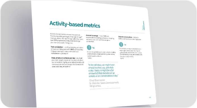 trics art 12 Activity-based metrics P ABSD me Activity-based metrics answer the question, Account coverage – if your SDRs are Dials-to-conversations – similar to “Are my reps doing enough of the right things?” responsible for building contacts or mapping dial-to-connects but an even higher bar How you define ‘the right things’ will reflect your accounts, you can track their progress own SDR playbook but they’ll be the things on this front you train and coach. Things like: Tip: Task completion – are they keeping up to date Tip: The industry average is 22.5 dials to one on tasks or falling behind? (ABSD software like meaningful conversation, but if you’re Engagio manages tasks and tracks task It takes 12.73 dials to get a connect when calling calling highly solicited divisions, such as completion – just sayin’) direct phone numbers and 18.83 when calling IT or Marketing, or very senior executives, switchboard numbers. the ratio is closer to 30:1. Dials, emails or contacts per day – you’ll set TOPO TOPO your own targets based on the daily schedule but remember: highly personalized emails and conversations do take longer than templated “In the old days, we might have ones (and they’re worth it) simply tracked, say, 300 dials a day. Today, it might be a fair amount of dials but also 10-12 emails, or 20 conversations a day.” Chad Burmeister Sr. Director, Sales Development, RingCentral 122