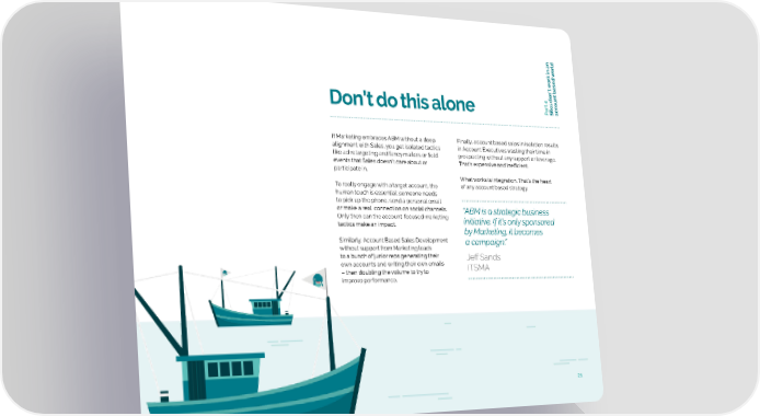orld ork in an w ’t based w t oun art 4c Don’t do this alone P Silos donac If Marketing embraces ABM without a deep Finally, account based sales in isolation results alignment with Sales, you get isolated tactics in Account Executives wasting their time in like ad retargeting and fancy mailers or field prospecting without any support or leverage. events that Sales doesn’t care about or That’s expensive and inefficient. participate in. What works is integration. That’s the heart To really engage with a target account, the of any account based strategy. human touch is essential: someone needs to pick up the phone, send a personal email or make a real connection on social channels. “ABM is a strategic business Only then can the account-focused marketing initiative. If it’s only sponsored tactics make an impact. by Marketing, it becomes Similarly, Account Based Sales Development a campaign.” without support from Marketing leads to a bunch of junior reps generating their Jeff Sands own accounts and writing their own emails ITSMA – then doubling the volume to try to improve performance. 21